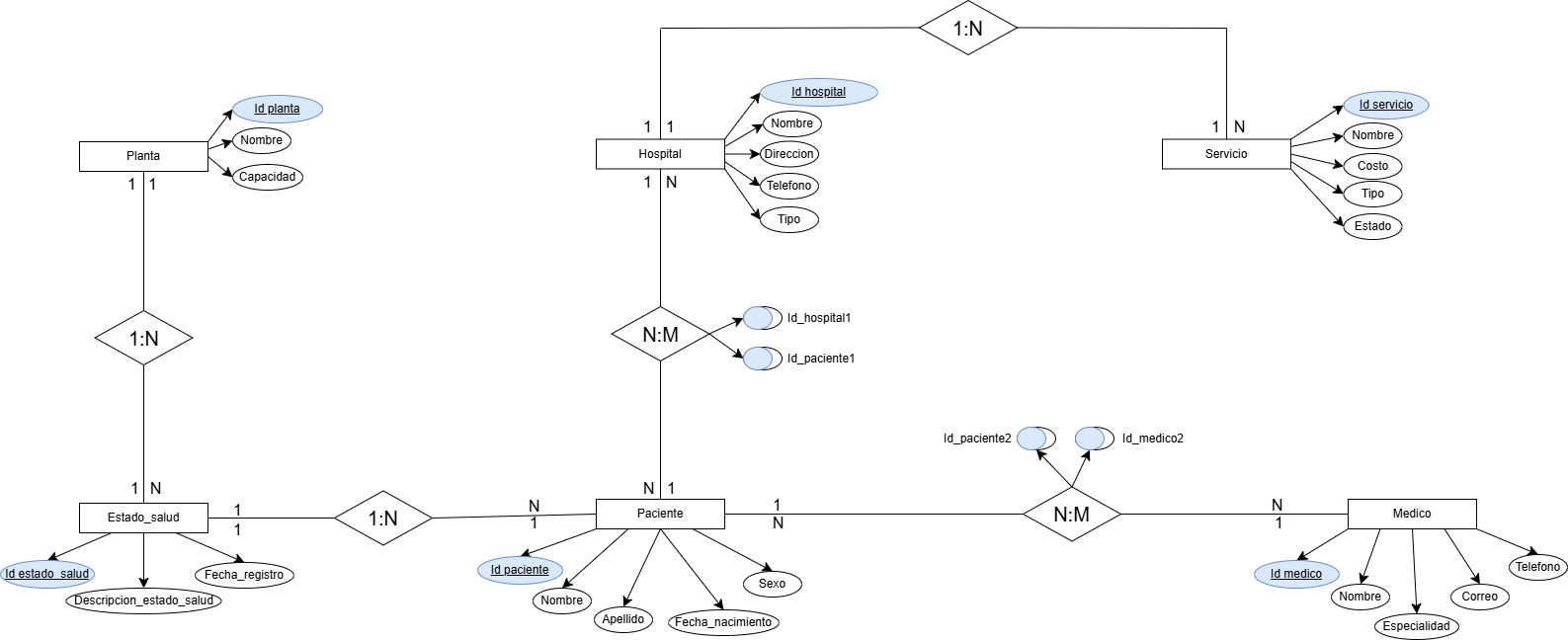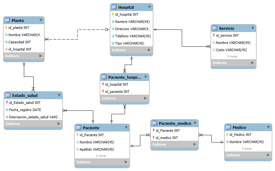 Realizar el diseño e implementación de una base de datos que guarde información de los pacientes que ingresan en un hospital. En este hospital, los pacientes que llegan al servicio de urgencias del hospital son examinados y, dependiendo de su estado de salud, son ingresados en la planta correspondiente (traumatología, cuidados intensivos, ...) bajo la supervisión de un médico responsable: