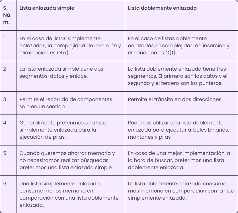3. Diferencias y similitudes entre las Listas Simplemente Ligadas y Listas Doblemente Ligadas
