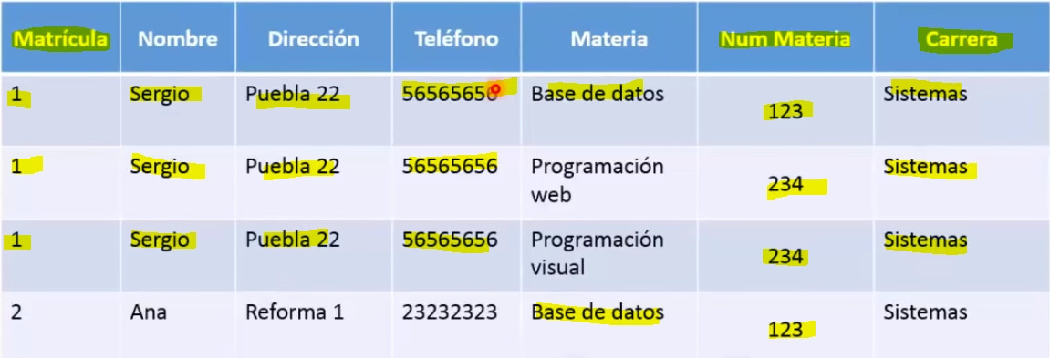 En la siguiente imagen identificamos redundancia de Datos, hay varios grupos de repetición, identificamos los campos con la redundancia de datos y empezamos con la normalizacion aplicando las formas.