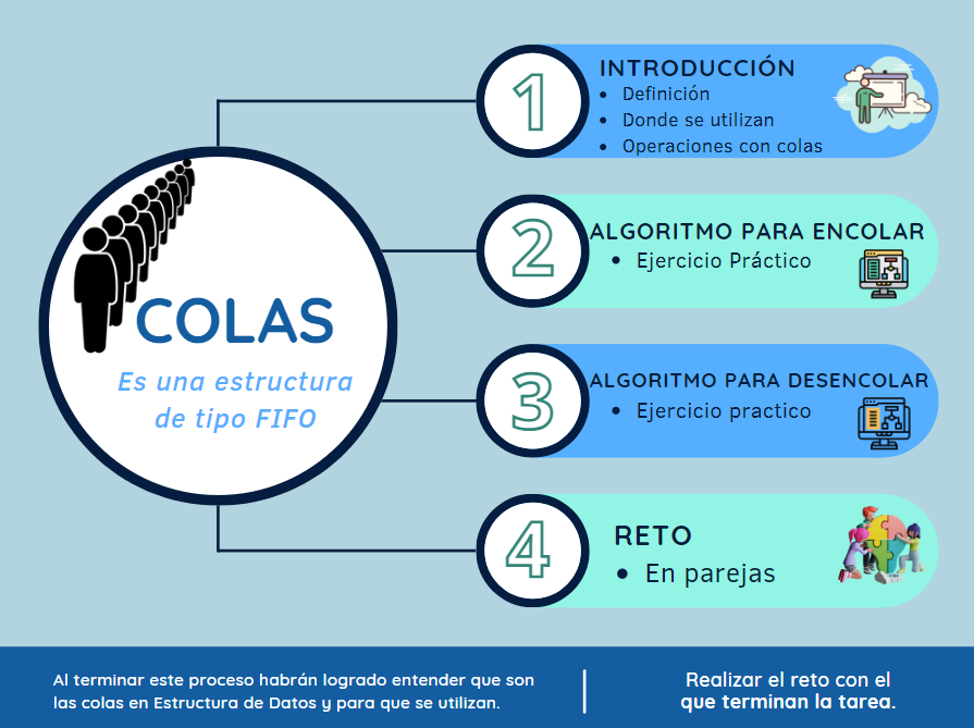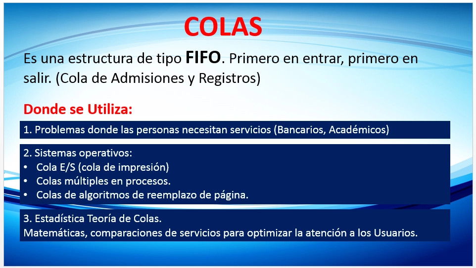 Una cola es una lista ordenada en la cual las operaciones de inserción se efectúan en un extremo llamado último y las operaciones de borrado se efectúan en el otro extremo llamado primero. Es una estructura FIFO (First Input First Output) primero en entrar primero en salir.