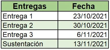 Fechas a tener en cuenta para entregar las diferentes actividades del Proyecto Final